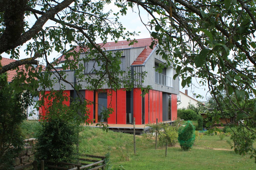 Übergangszonen zwischen innen und außen als Sicht- und Sonnenschutz mit Schiebeelementen aus roten Lochblech-Alu-Tafeln